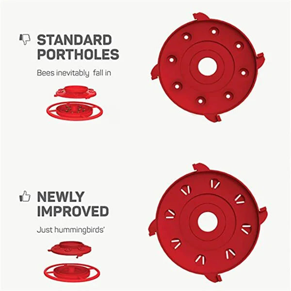 • Enticing feeder This vibrant red hummingbird feeder holds 16 ounces of nectar, which is sure to draw a large flock of hummingbirds to your backyard. Eight circular feeding openings and perches allow multiple birds to feed at the same time.